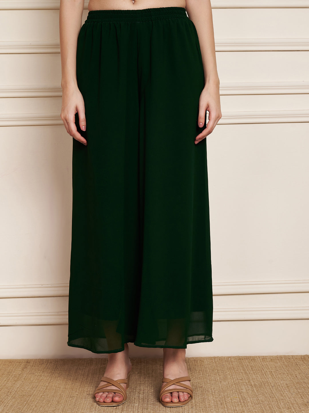 Elevate your festive wardrobe with this Green Georgette Tiered Anarkali Kurta with Sharara from Poshak Hub. Crafted from soft georgette, the tiered kurta features a sweetheart neckline, full sleeves, calf-length design, and flared hem for a graceful and flowing silhouette. The ankle-length sharara comes with an all-round elasticated waistband for comfort and ease of wear. Perfect for weddings, parties, and festive occasions, this ensemble combines elegance with contemporary ethnic style.