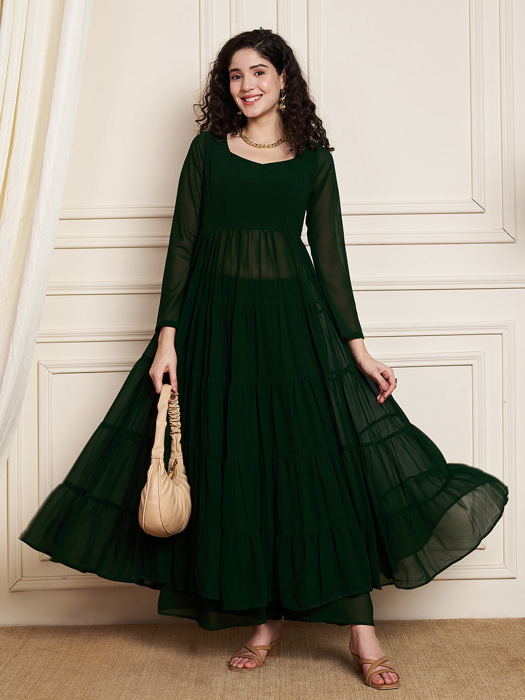 Poshak Hub Women Green Georgette Tiered Anarkali Kurta with Sharara