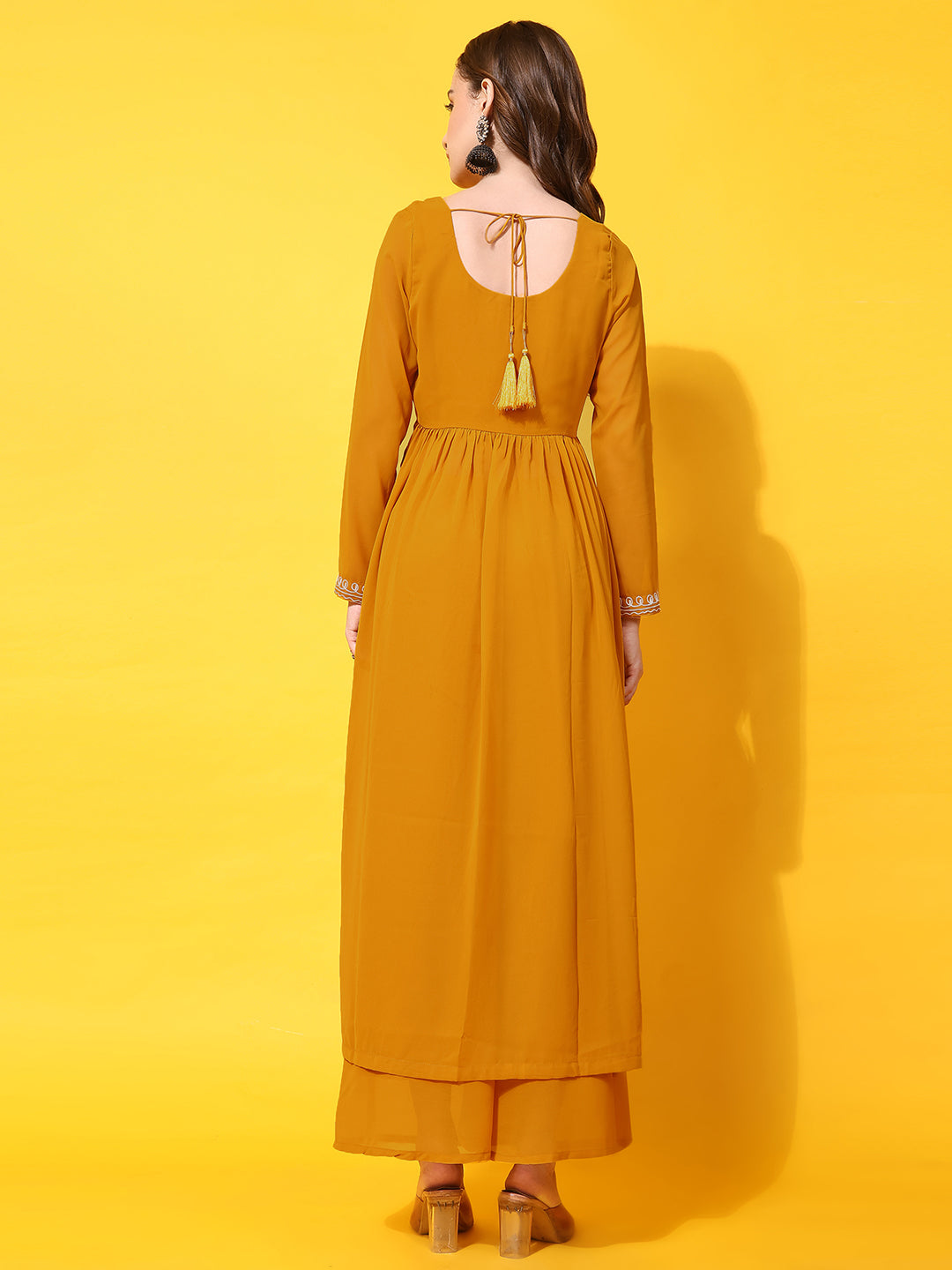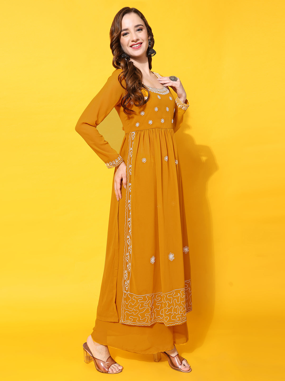 Bring a touch of elegance to your festive wardrobe with this Poshak Hub Women Lavender Georgette Aari Work A-Line Kurta with Sharara. Crafted in flowy georgette, the A-line kurta is adorned with delicate Aari work embroidery, giving it a refined and traditional charm. Featuring a round neckline, full sleeves, and a straight hem, it pairs beautifully with the coordinated ankle-length sharara. Perfect for weddings, festive occasions, and evening events, this set combines style, comfort, and grace.