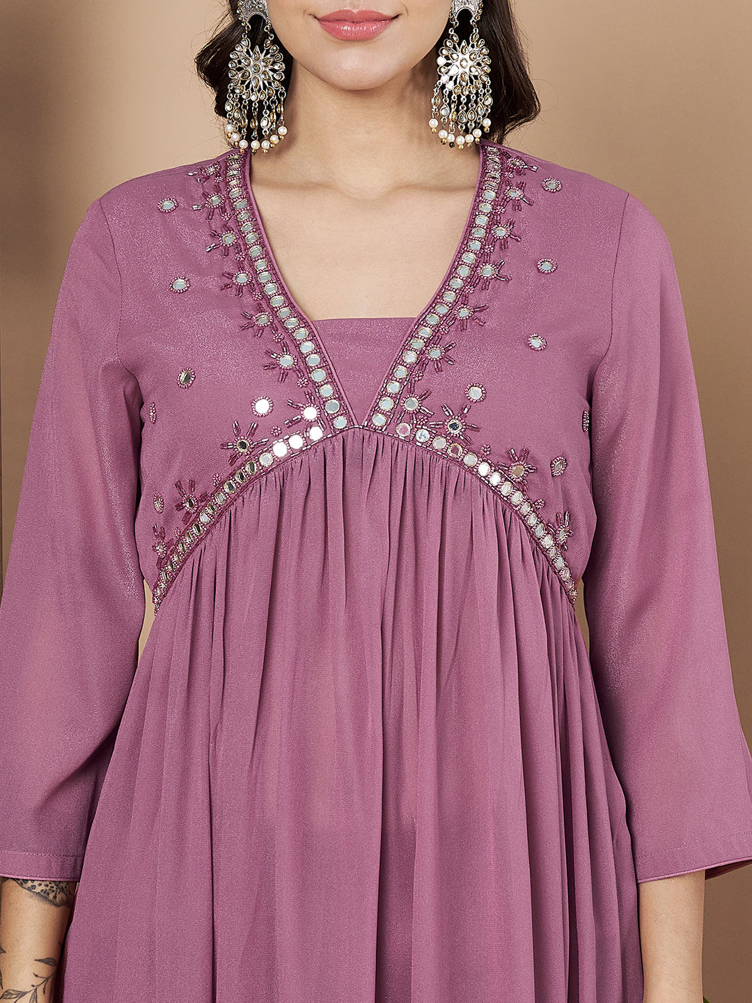 Step into festive elegance with this Pink Star Georgette Alia Cut A-Line Kurta with Palazzo from Poshak Hub. Crafted in soft star georgette, the kurta features intricate mirror work and hand embroidery, giving it a traditional yet glamorous appeal. The Alia cut A-line silhouette enhances the flow and elegance of the outfit, while the ankle-length palazzo completes the ensemble for a stylish ethnic look. Perfect for weddings, parties, and festive occasions, this set combines comfort with exquisite craftsmanship.