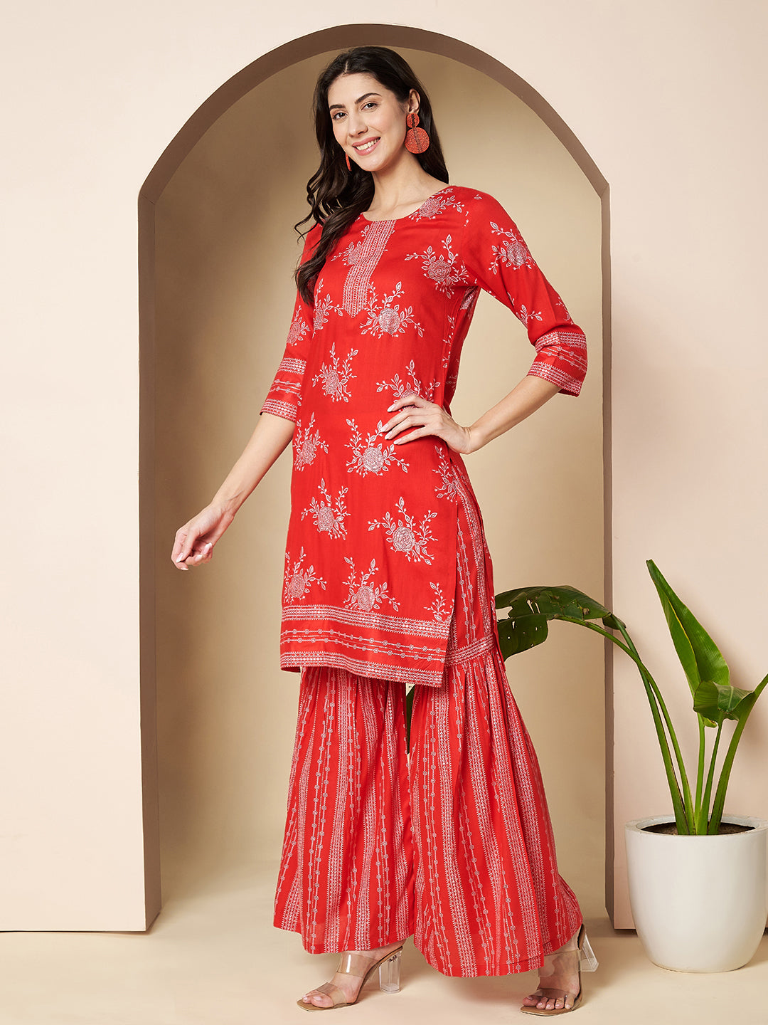 Elevate your ethnic style with this Red Rayon A-Line Kurta with Sharara from Poshak Hub. Crafted from soft and lightweight rayon, the kurta features a round neckline, 3/4th sleeves, knee-length design, and straight hem for a comfortable and chic fit. Paired with an ankle-length sharara with an all-round elasticated waistband, this ensemble combines elegance with ease of wear. Perfect for festive occasions, casual gatherings, and family celebrations.