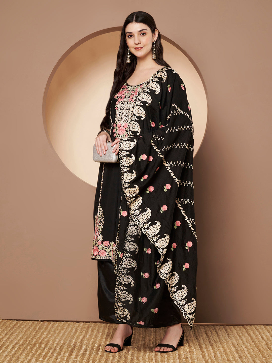 Bring charm and elegance to your ethnic collection with this Black Floral Aari Work Embroidered Kurta with Palazzo & Embroidered Dupatta. The straight kurta is beautifully highlighted with vibrant floral embroidery, adding a touch of richness to the classic black base. Paired with a solid palazzo for comfort and a matching embroidered dupatta for a graceful finish, this three-piece ensemble is the perfect outfit for festive events, evening parties, and traditional gatherings.