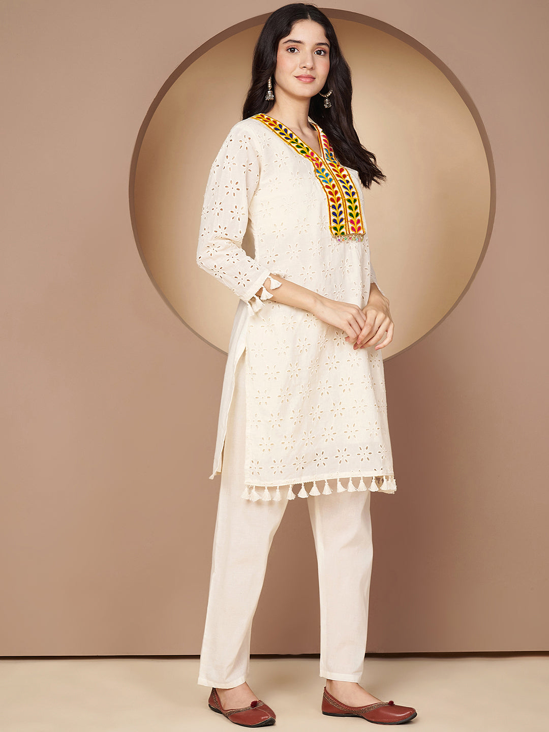 Elevate your ethnic wardrobe with this elegant Poshak Hub Off-White Premium Cotton Hakuba Chicken Embroidery Co-Ord Set. Crafted from high-quality cotton schiffli fabric, the top features intricate Aari work embroidery, a flattering V-neckline, and 3/4th sleeves for a graceful look. The knee-length design comes with an attached cotton lining for added comfort. Paired with matching ankle-length trousers, this co-ord set combines traditional artistry with modern elegance — perfect for festive gatherings, casual outings, or special occasions.