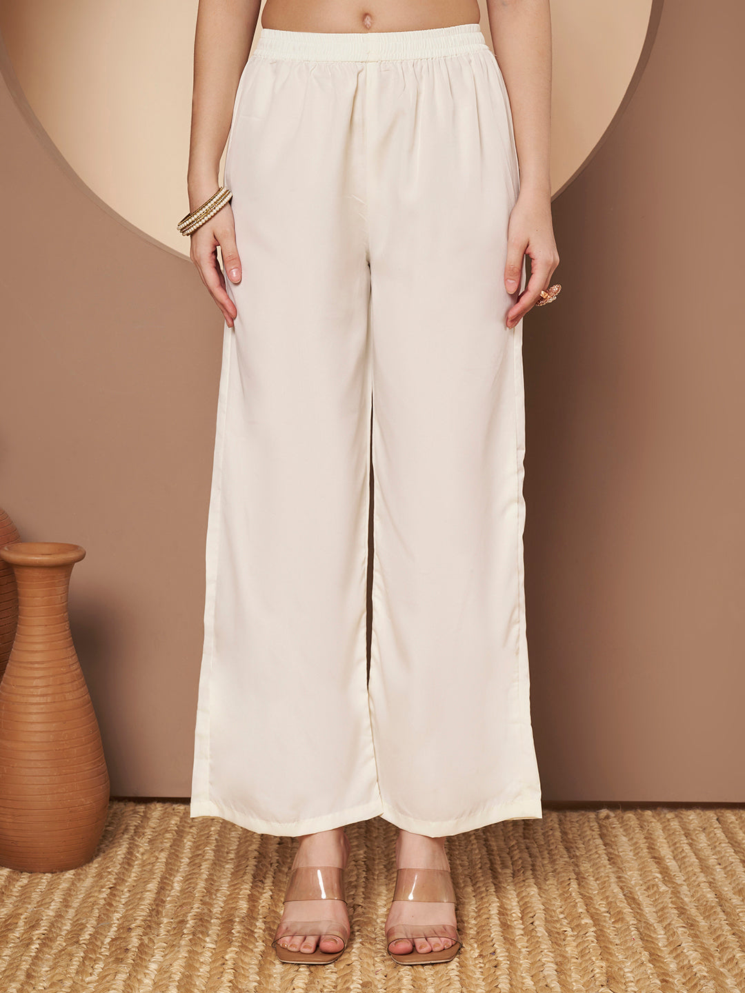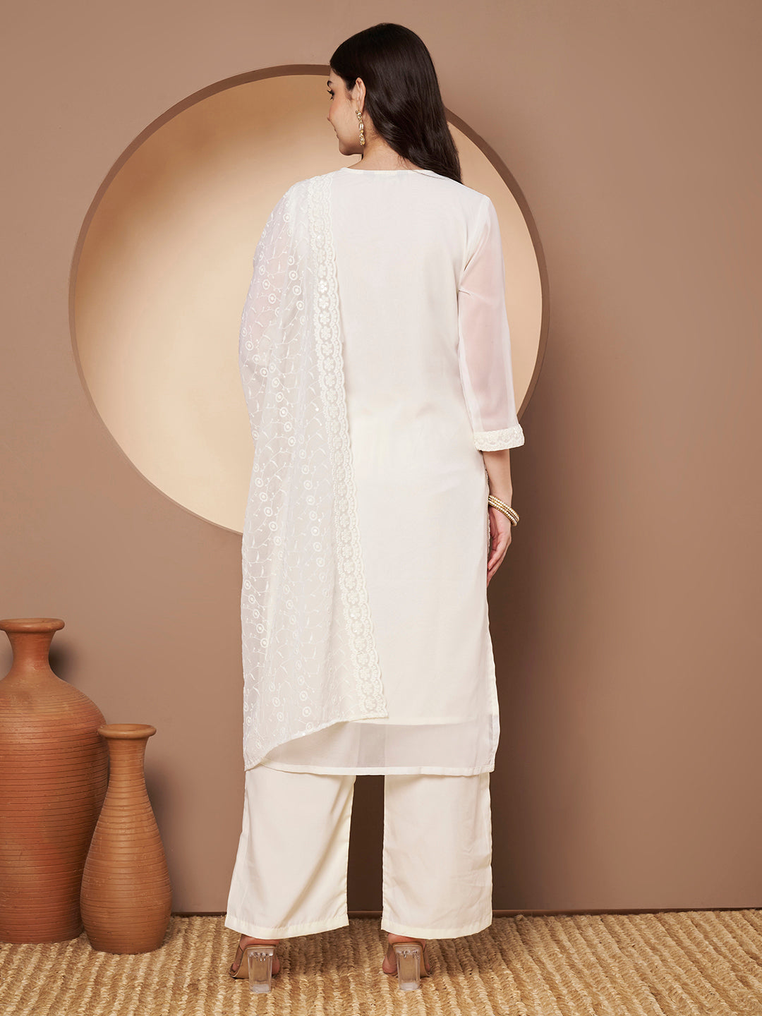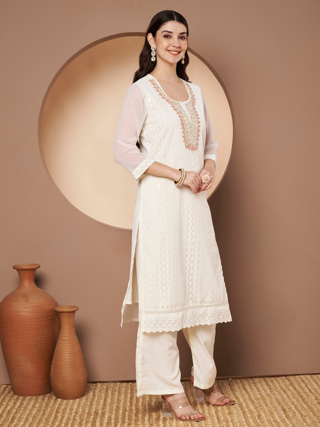 Off-White & Peach Chikankari Adda Work Embroidered Kurta with Palazzo and Embroidered DupattaExude elegance with this off-white and peach kurta set, beautifully designed with Chikankari Adda embroidery and delicate lace detailing. It comes with solid palazzo trousers and a matching embroidered dupatta, making it ideal for festive, wedding, and traditional occasions.