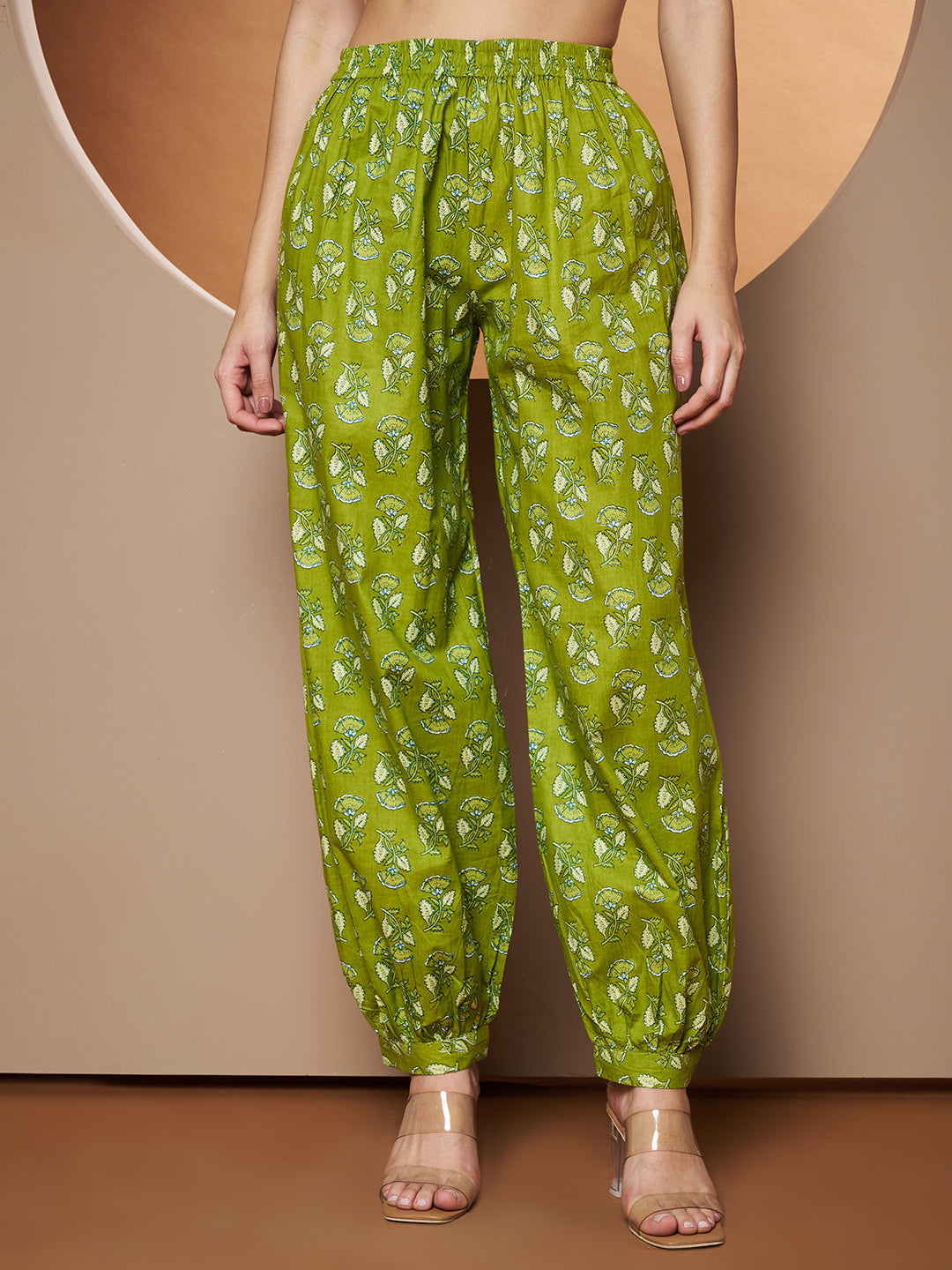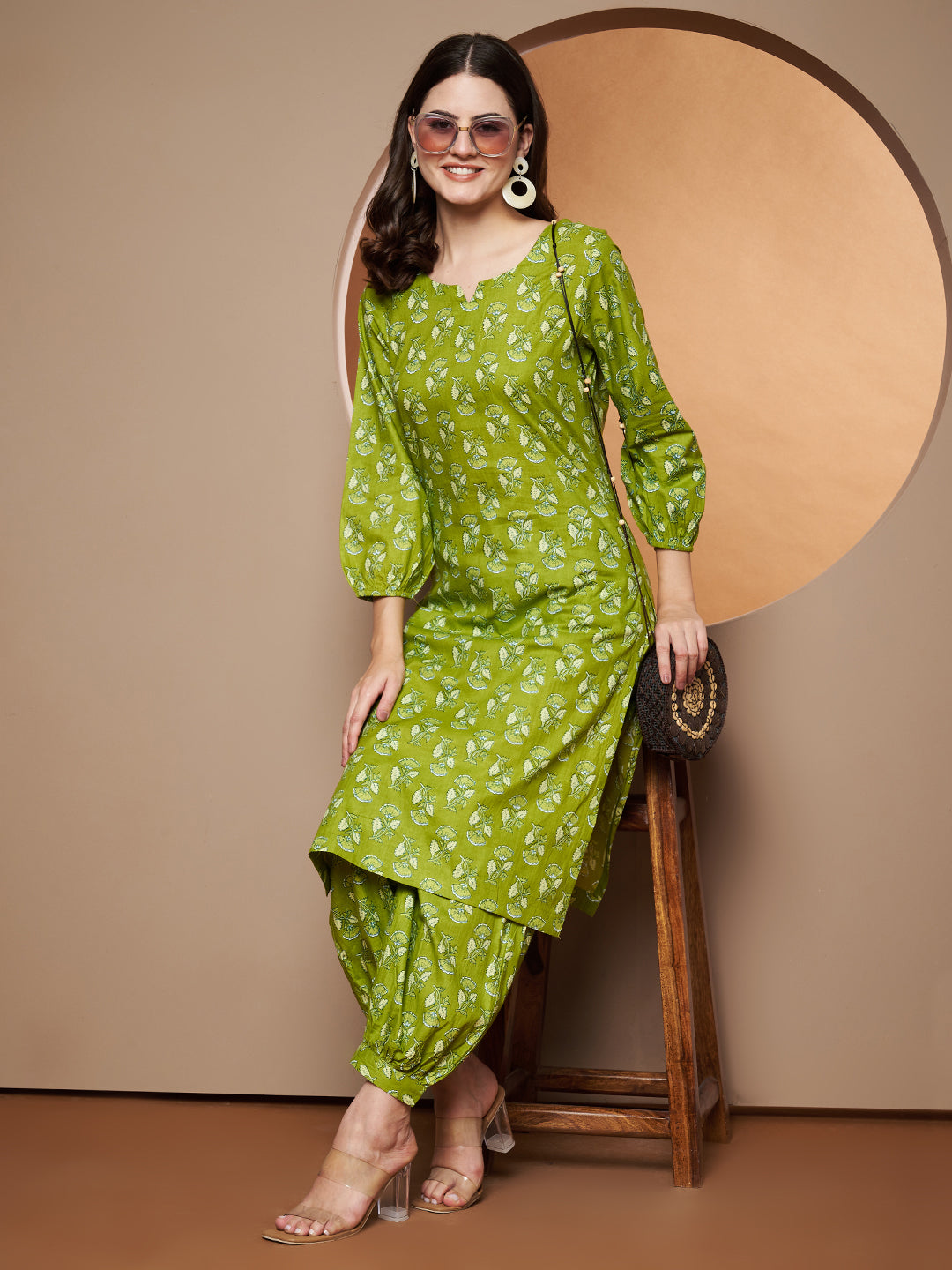 Add charm to your ethnic wardrobe with this Green Cotton Printed A-Line Kurta with Afgani Salwar from Poshak Hub. Crafted from soft, breathable cotton, the kurta features a sweetheart neckline and 3/4th sleeves for a stylish and comfortable fit. Paired with an ankle-length Afgani salwar, this ensemble offers a traditional yet contemporary ethnic look. Perfect for casual outings, festive occasions, and family gatherings, it combines comfort with everyday elegance.