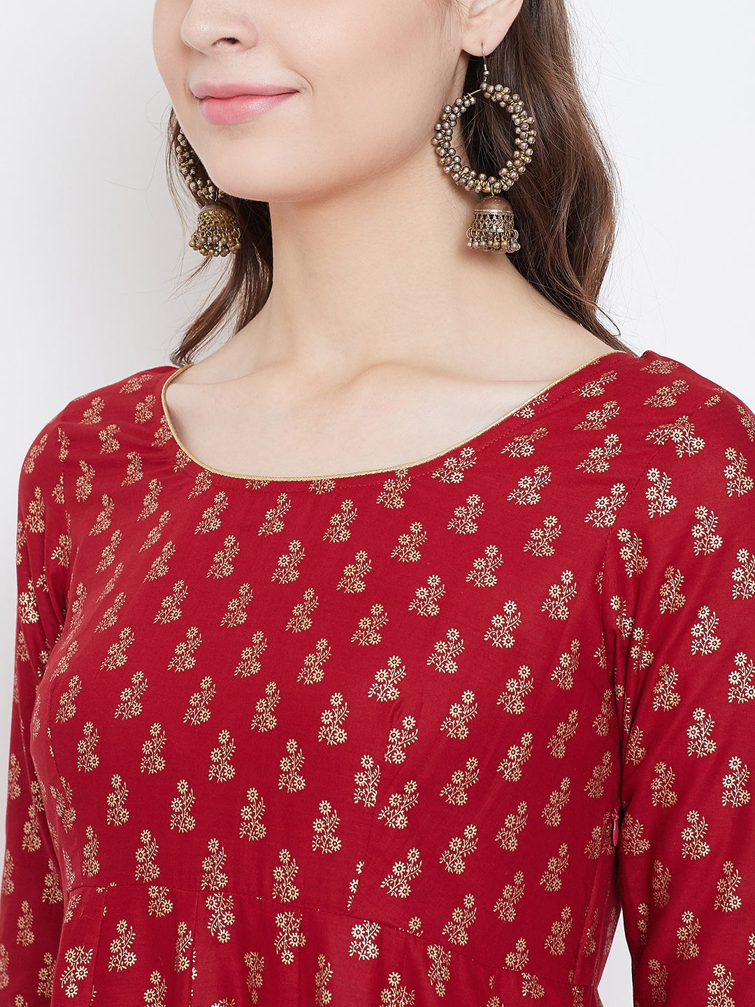 Poshak Hub Women Red Cotton Golden Printed Anarkali Kurta.