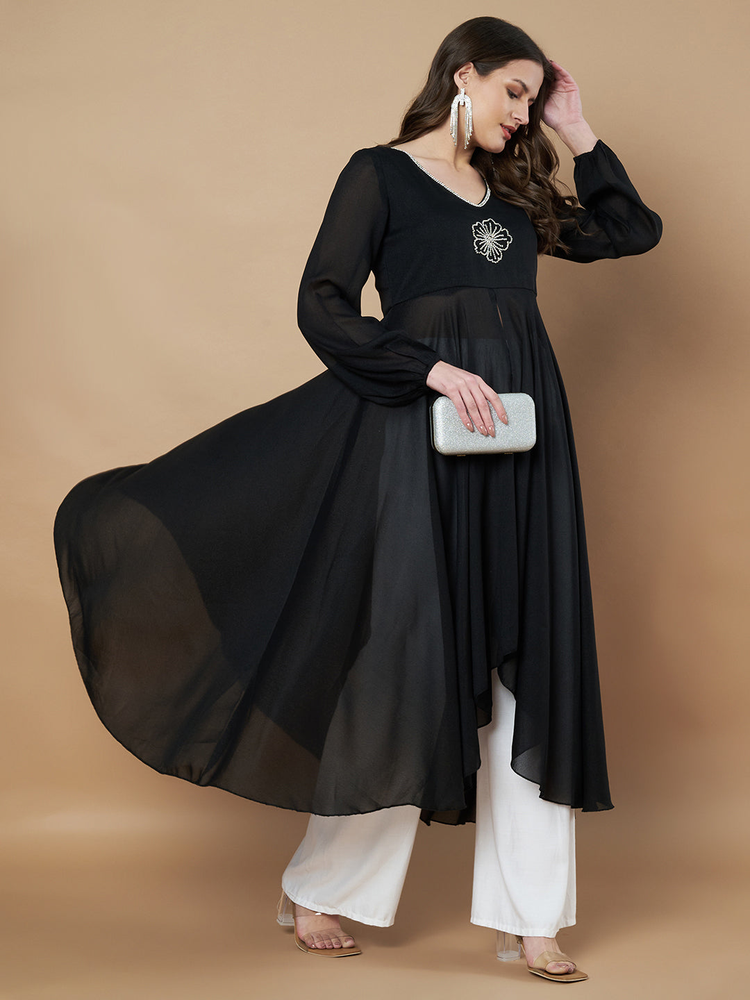 Step out in style with this Black Star Georgette Hand Embroidery Frontslit High-Low Anarkali Kurta from Poshak Hub. Designed with a trendy front slit and a high-low hemline, this kurta blends modern fashion with ethnic charm. The V-neckline and full sleeves give it a graceful appeal, while the hand embroidery on the front yoke adds a touch of traditional elegance. Crafted in lightweight star georgette fabric, it is calf-length and perfect for festive occasions, parties, and cultural gatherings.