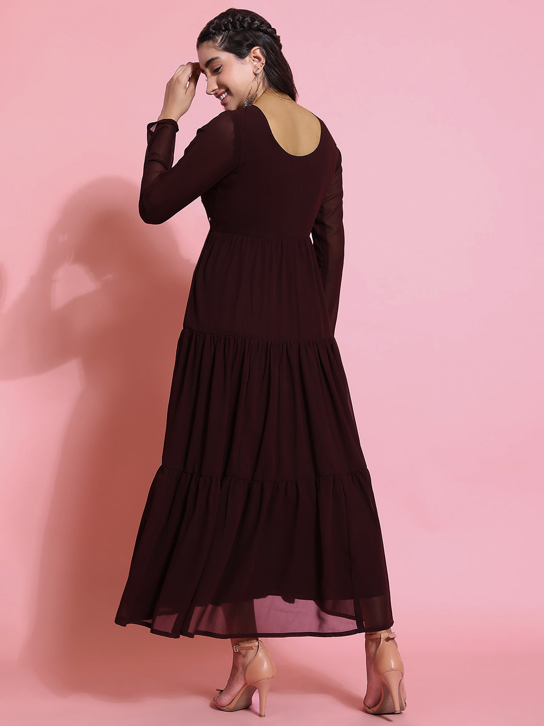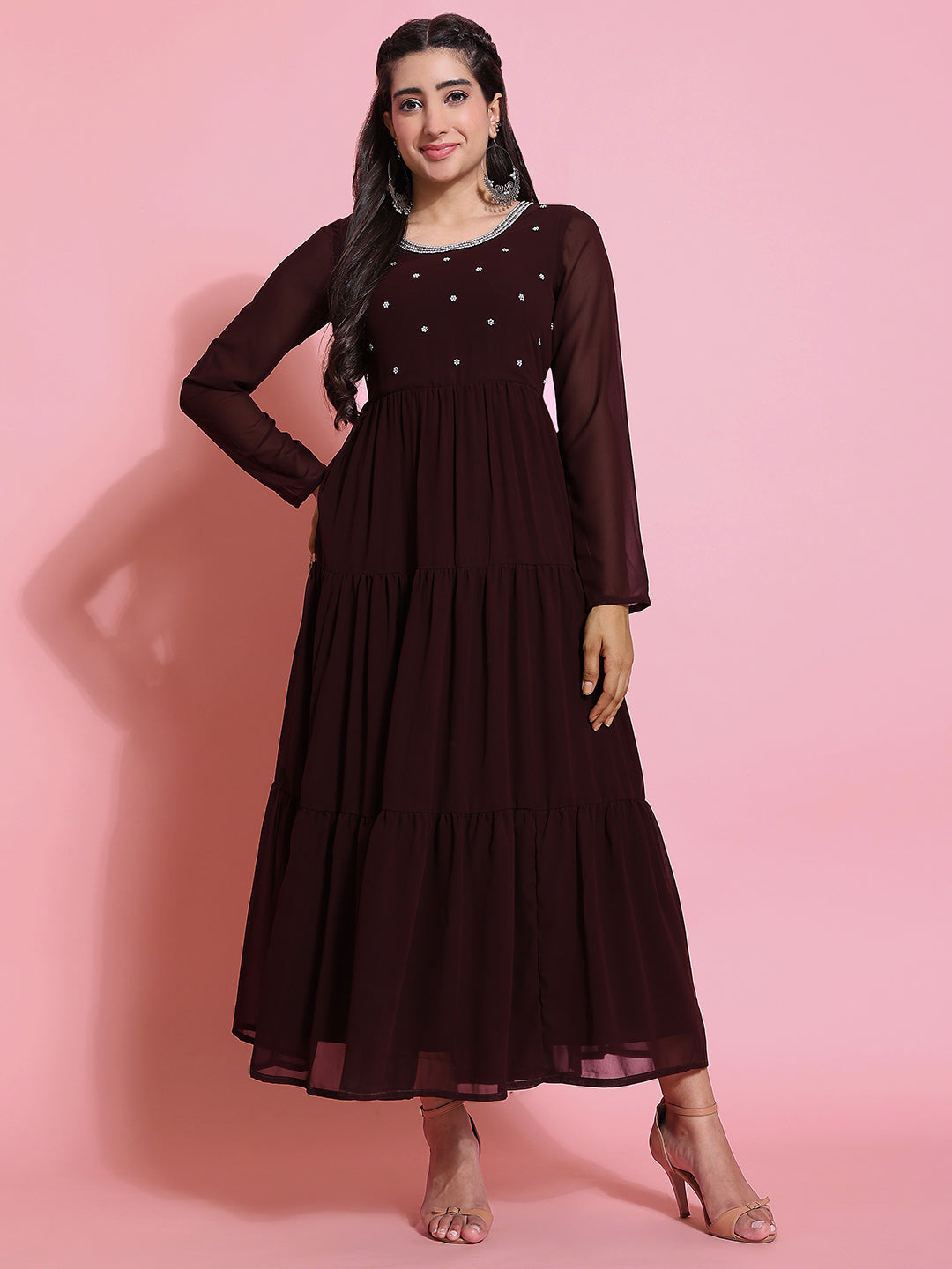 Poshak Hub Women Brown Georgette Embroidery Tiered Anarkali Kurta