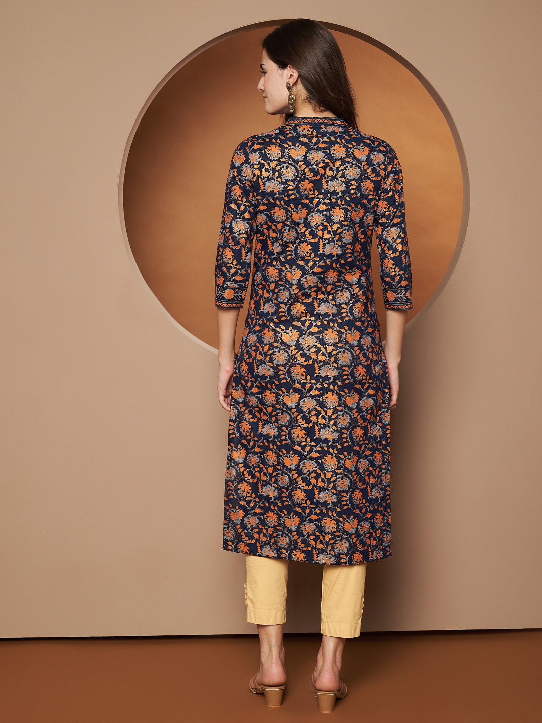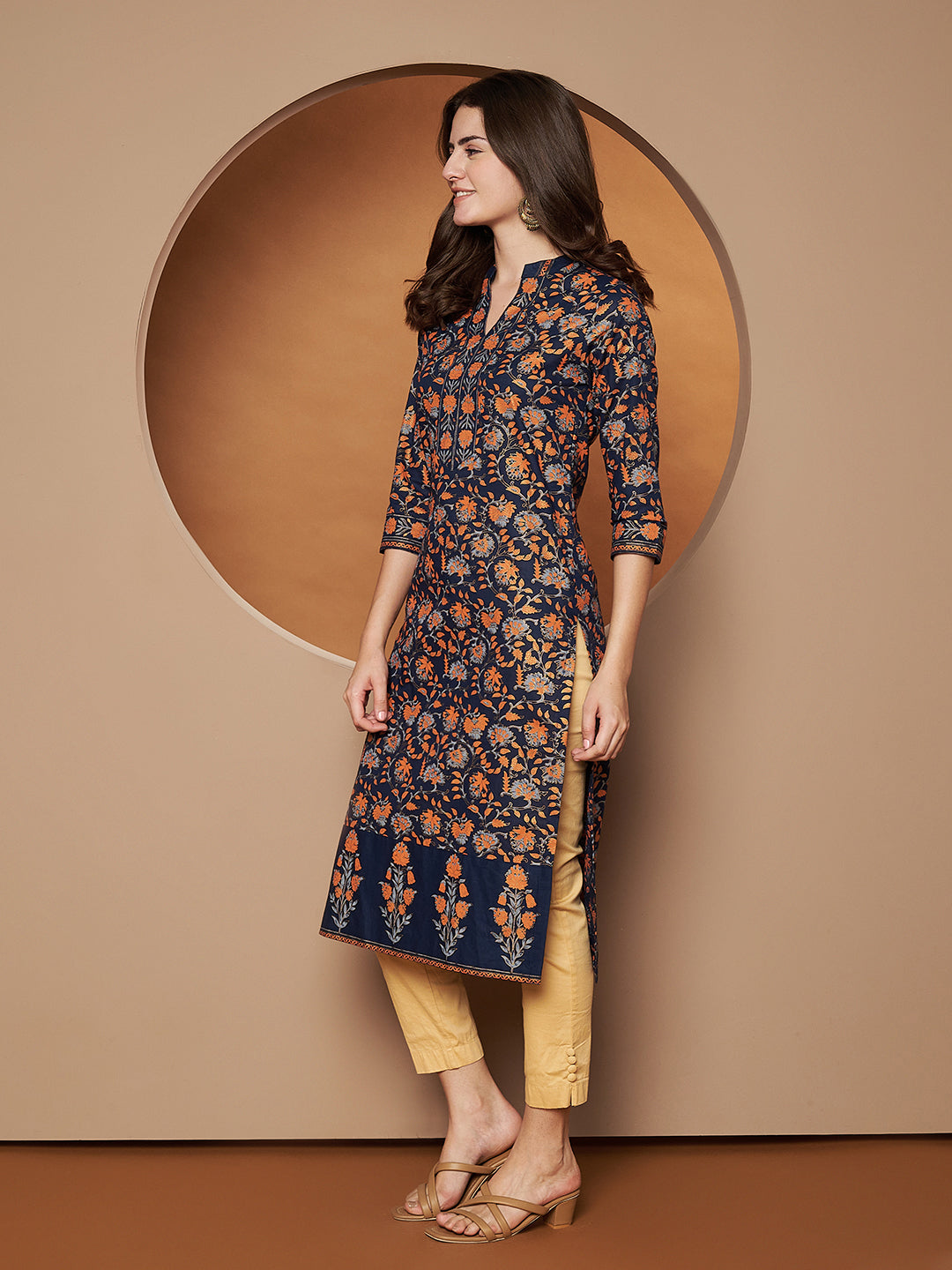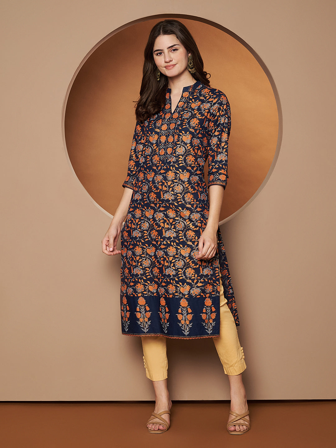 Add a touch of elegance to your ethnic collection with the Poshak Hub Women Cotton Blue Gold Print Straight Kurta. Designed with a Mandarin neck, 3/4th sleeves, and a calf-length straight hem, this kurta offers both comfort and grace for any occasion.