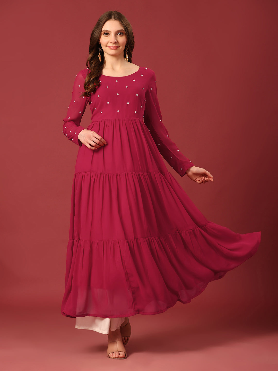 Poshak Hub Women Dark Pink Georgette Embroidery Tiered Anarkali Kurta