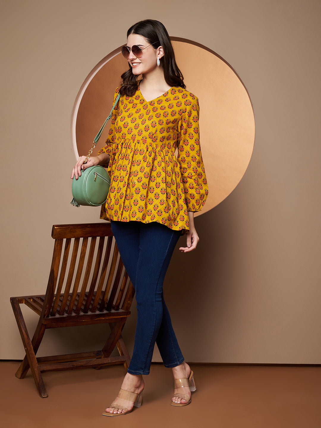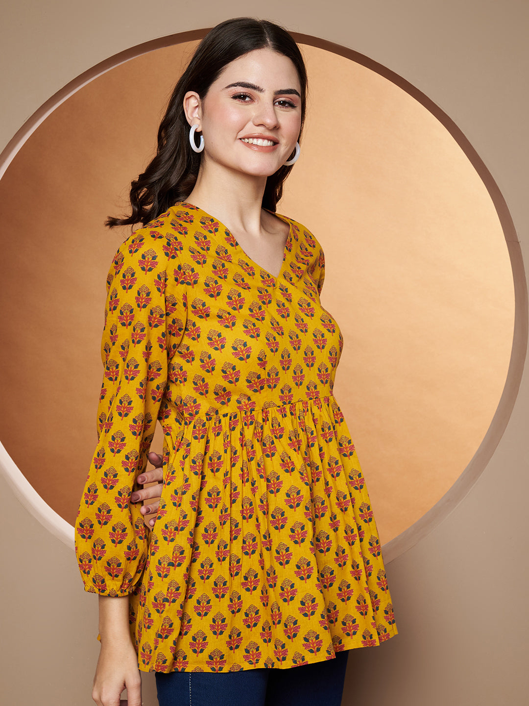 Add a cheerful touch to your casual wardrobe with this Poshak Hub Yellow Cotton Floral Print V-Neck Top. Made from soft and breathable cotton, the top features a flattering V-neck, 3/4th sleeves, and a straight hem for a comfortable and stylish fit. Its vibrant yellow base with floral prints makes it perfect for pairing with jeans, skirts, or palazzos. Ideal for casual outings, office wear, or family gatherings, this top combines comfort with a bright, playful style.
