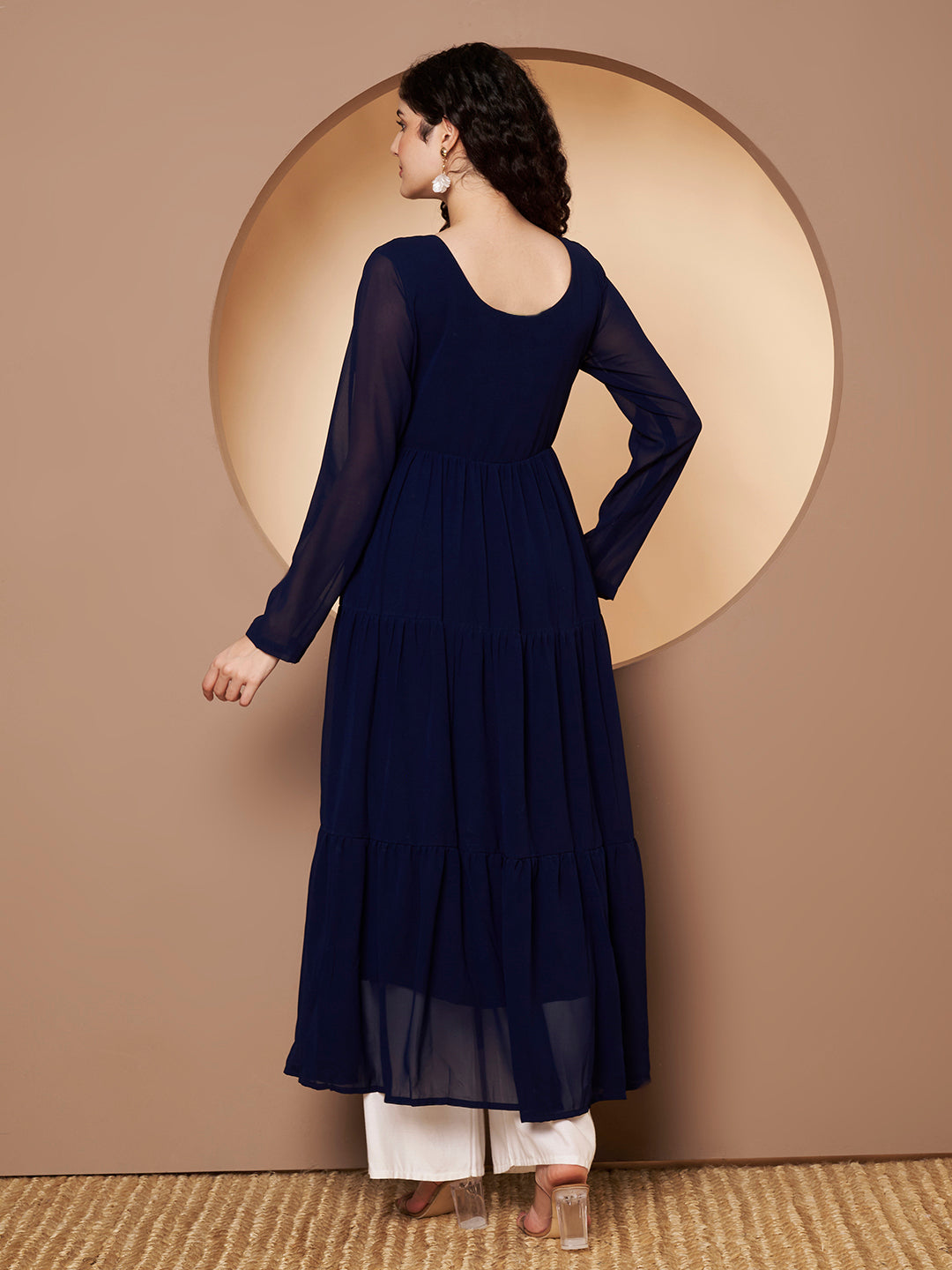 Bring grace and tradition together with the Poshak Hub Women Blue Georgette Tiered Anarkali Kurta. Made from soft georgette with an inner lining, this kurta ensures comfort while offering a flowy, elegant look. The ankle-length tiered silhouette gives it a regal charm, while the hand embroidery on the neck and front yoke adds a touch of sophistication. Designed with a round neckline and full sleeves, it is perfect for festive occasions, weddings, and cultural gatherings.