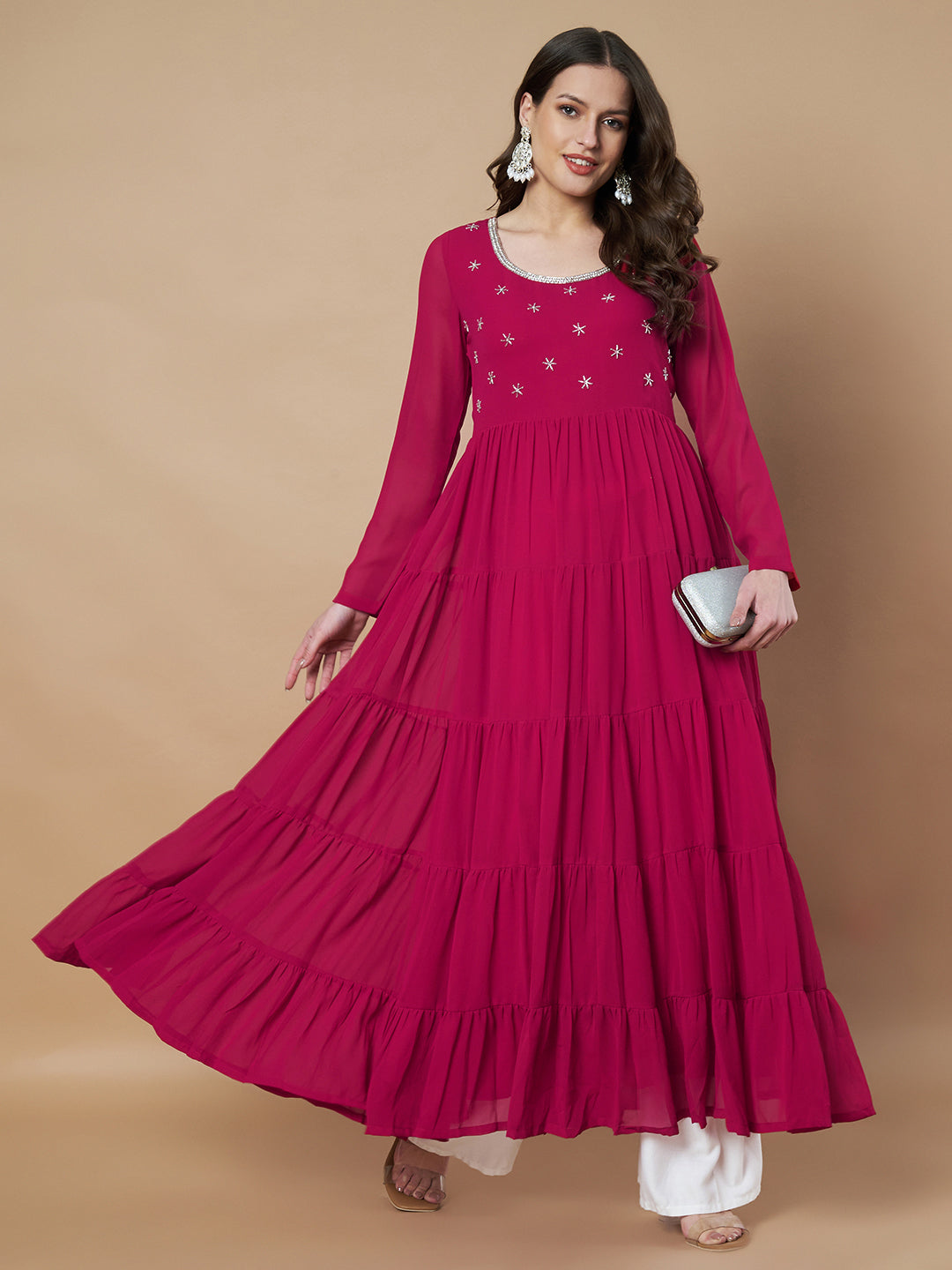 Add elegance and charm to your festive wardrobe with this Pink Georgette Hand Embroidery Tiered Anarkali Kurta from Poshak Hub. Made from soft georgette fabric, this kurta features a tiered design for a flowy silhouette and intricate hand embroidery on the front yoke for a traditional touch. The round neckline, full sleeves, and ankle-length design create a graceful and timeless look. An inner lining ensures comfort, making it perfect for weddings, parties, and cultural celebrations.